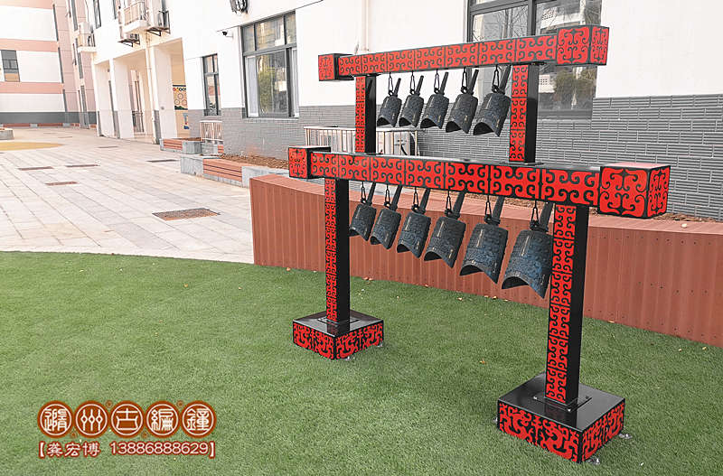 簡介:編鐘外形按照曾侯乙編鐘制作,青銅鑄造;采用標(biāo)準(zhǔn)音高A=440Hz調(diào)音,要求聲音清脆悅耳,有延續(xù)音,無啞音編鐘,半音齊備,音位表詳見設(shè)計圖,編鐘采用雙層設(shè)計,下層懸掛6件甬鐘,上層懸掛5件甬鐘。