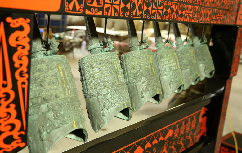簡介:12件編鐘分2層排列,上6件下6件,編鐘為青銅鑄造,樣式可選,有長枚甬鐘、短枚甬鐘、滿花紋甬鐘、有紋鈕鐘和無紋鈕鐘等多種鐘型,承托編鐘的木架采用高密度板加工,表面噴繪仿古紋飾。配套有演奏工具、收藏證書等附件。
