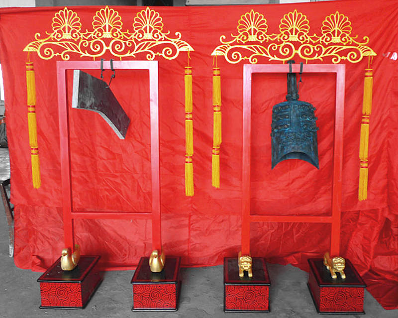3、特鐘規(guī)格:長0.9米×寬0.4米×高1.8米,鐘體口徑35厘米,高75厘米,編鐘為青銅鑄造而成,表面顏色為古銅綠色。