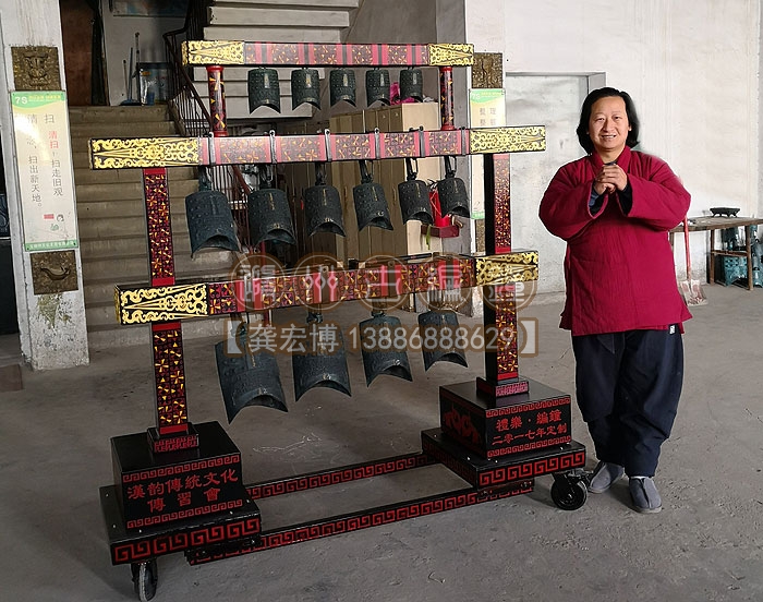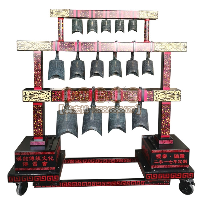 合肥漢韻文化傳習(xí)會(huì)定制的15件3層編鐘長(zhǎng)1.9米、高1.86米、寬0.5米,音律齊全,演奏使用方便,木架上可以彩繪客戶定制文字或圖案,底部安裝鋼制滑輪,安裝移動(dòng)都非常方便,配有樂器標(biāo)準(zhǔn)航空箱,外出表演得心應(yīng)手。